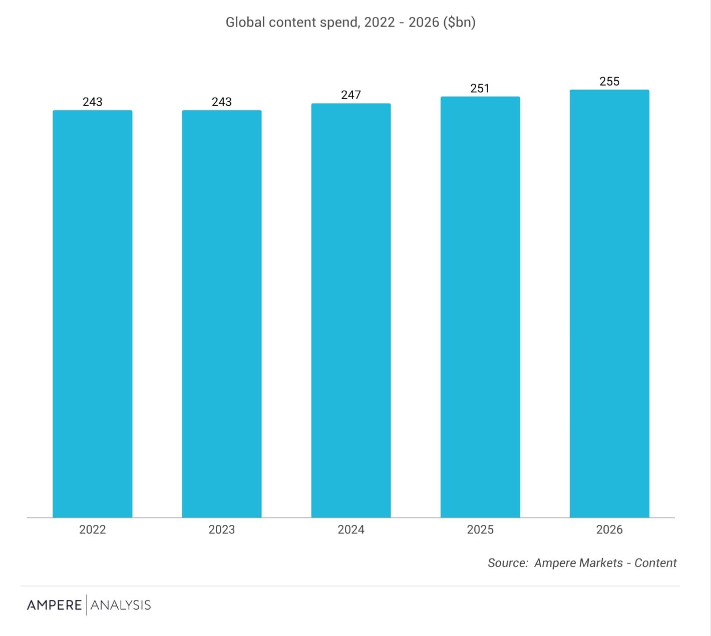 According to Ampere Analysis, global content spend will increase 2% annually and reach $255 billion in 2026.