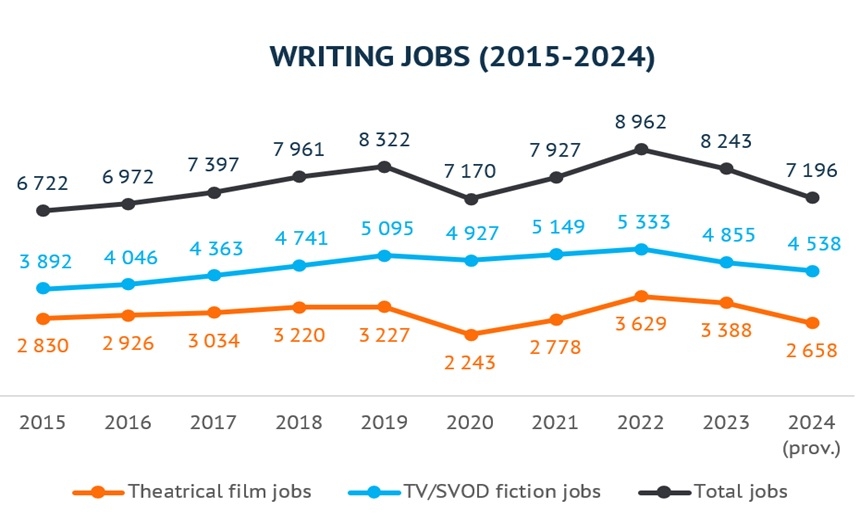 Between 2015 and 2024, almost half of all theatrical films released each year were directed by debut filmmakers, highlighting the sector’s high turnover rate. Although Europe produces more feature films overall, nearly two-thirds of writing jobs were generated by TV and SVOD productions.